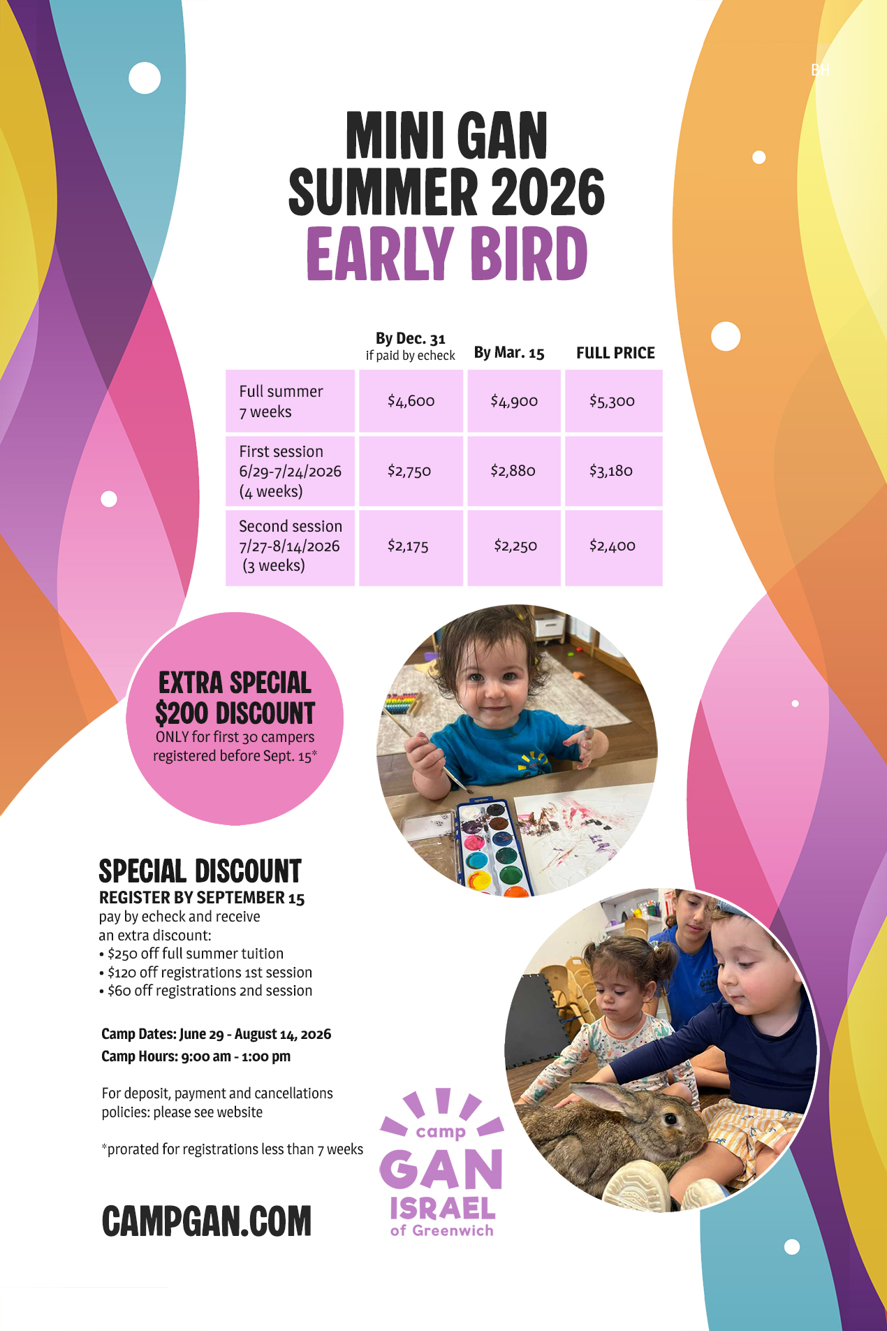 Registrations received by 12/31/2025: Half of tuition amount minus deposit due on 12/31/2025 and remaining balance due on 3/15/2026